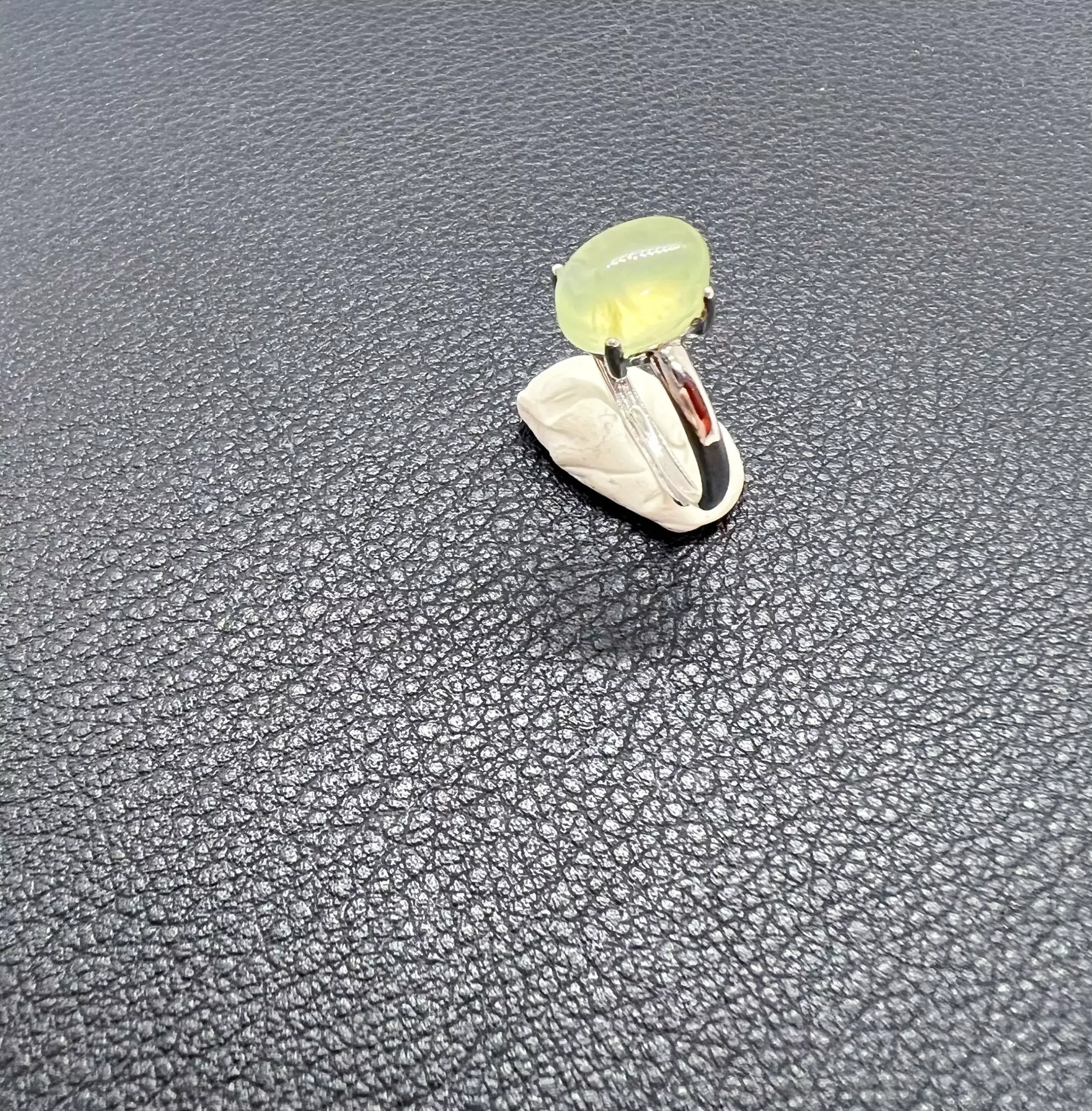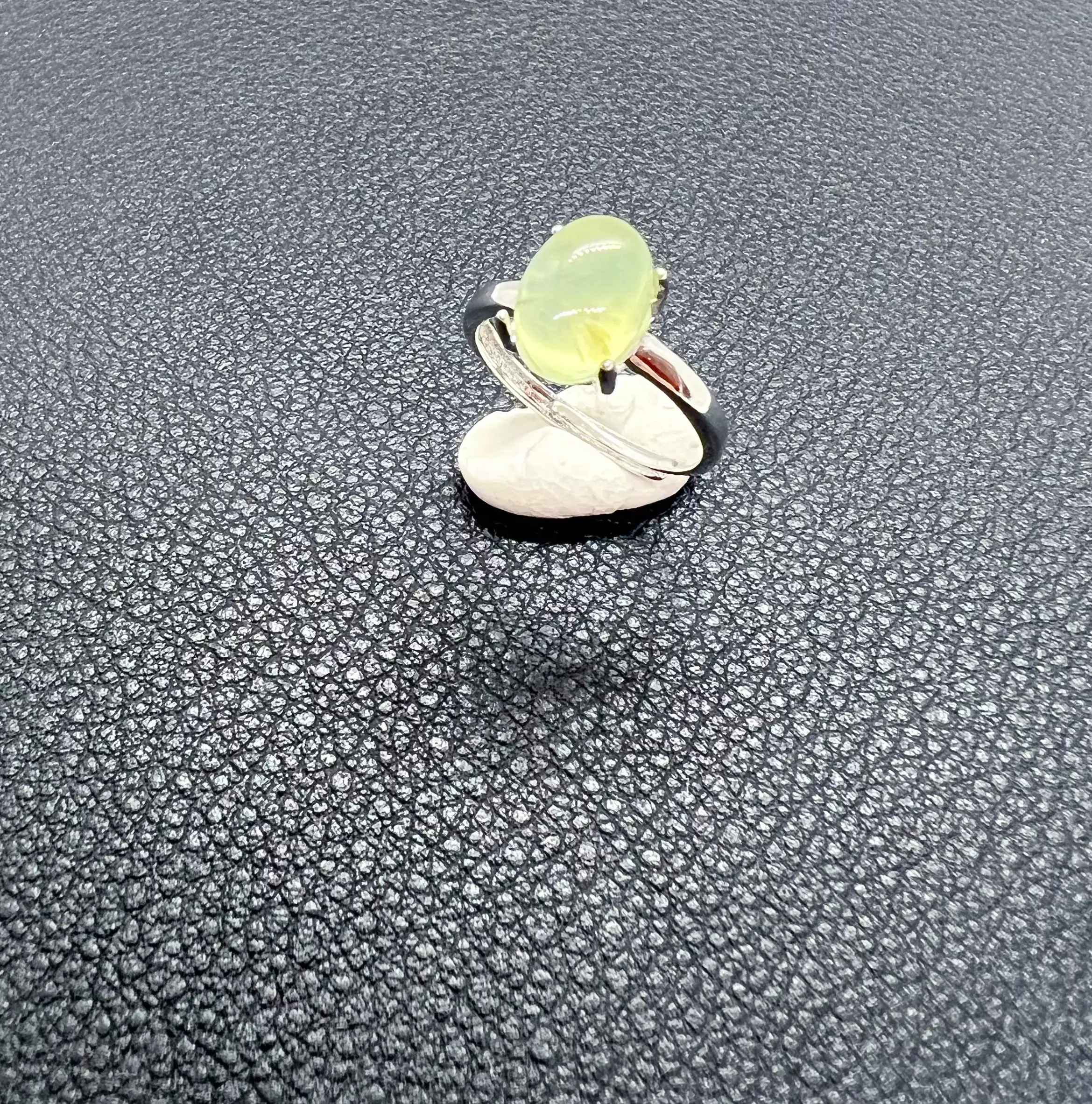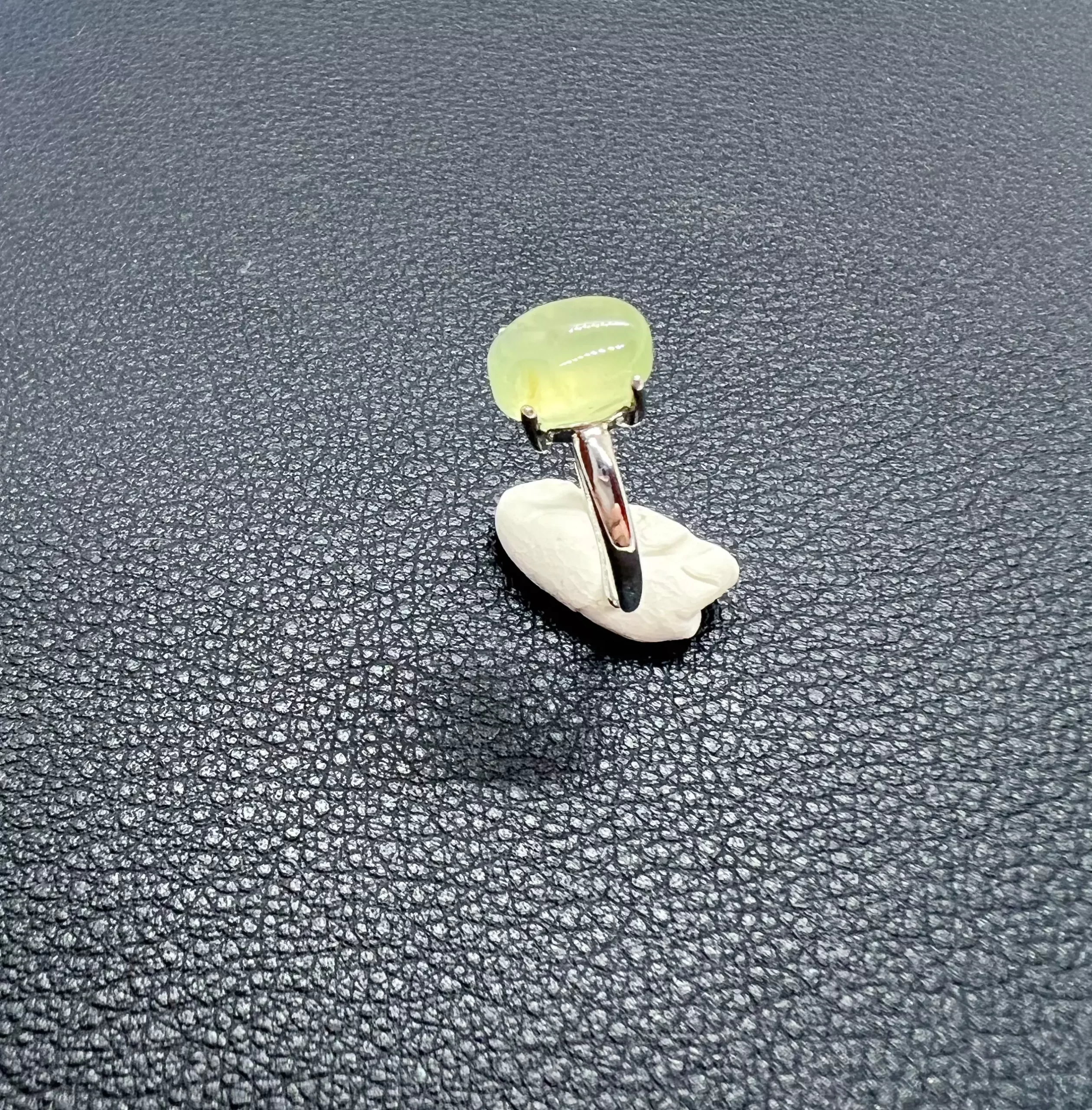 Cette bague met en valeur une préhnite ovale de 7 × 11 mm, polie en cabochon bombé, dont la transparence vert tendre rappelle une petite grappe de raisin encore fraîche. Sa surface lisse et brillante capte la lumière comme la peau d’un raisin vert, avec un éclat doux et juteux.