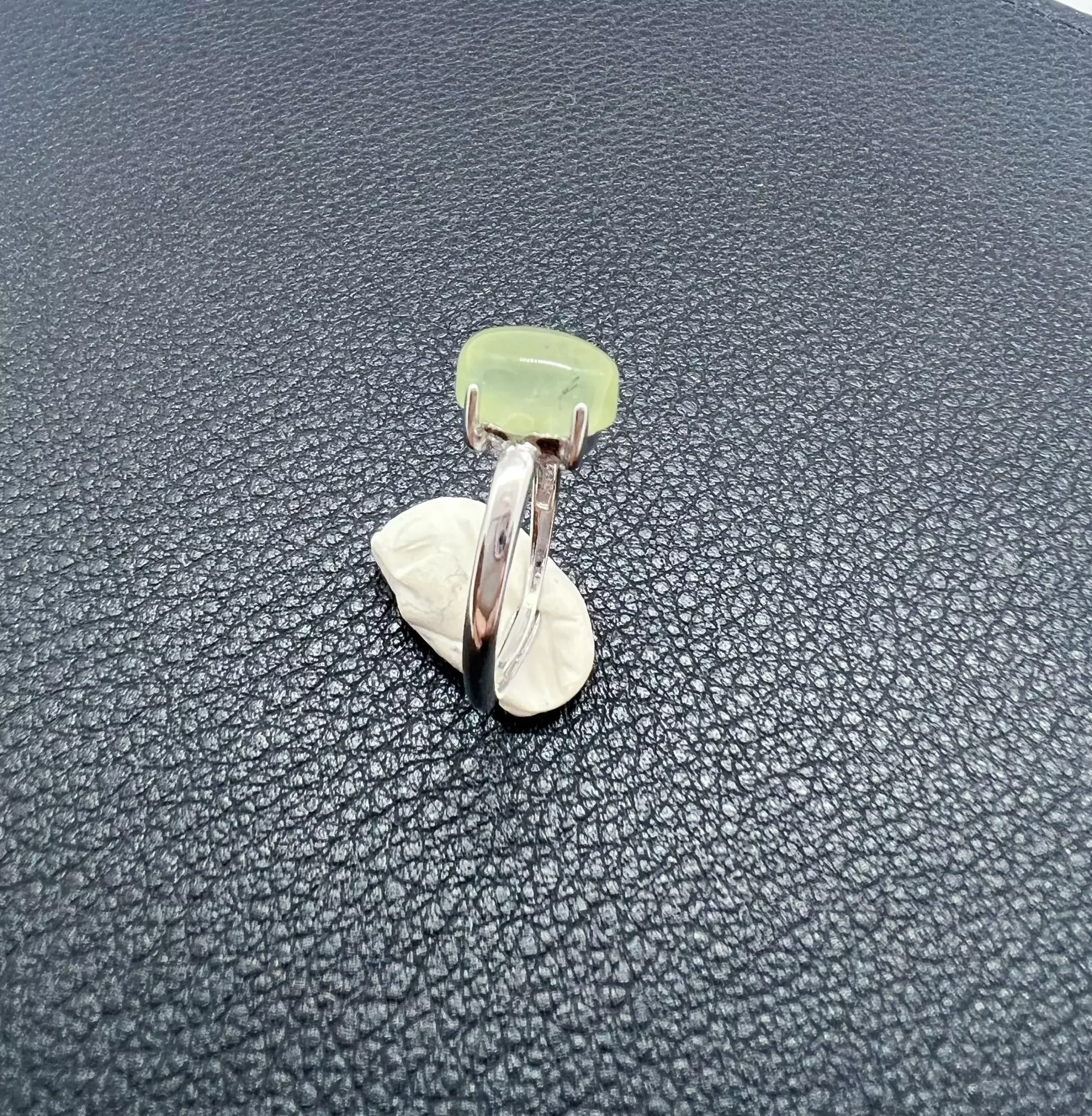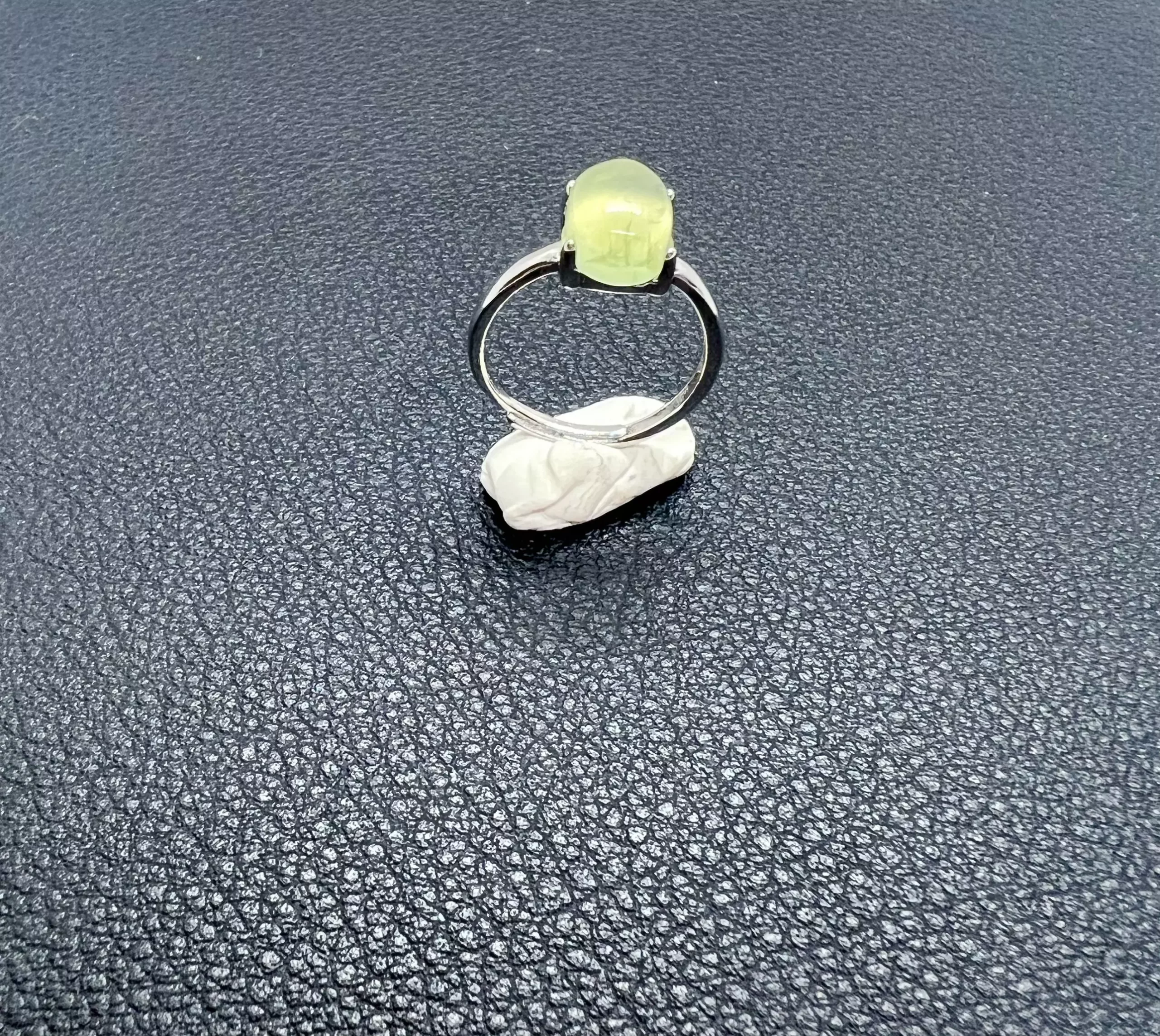 Bague réglable en plaqué argent, sertie d’une préhnite ovale 7 × 11 mm (épaisseur env. 5 mm), lisse et translucide, évoquant un grain de raisin vert. Convient aux doigts jusqu’à la taille 49.