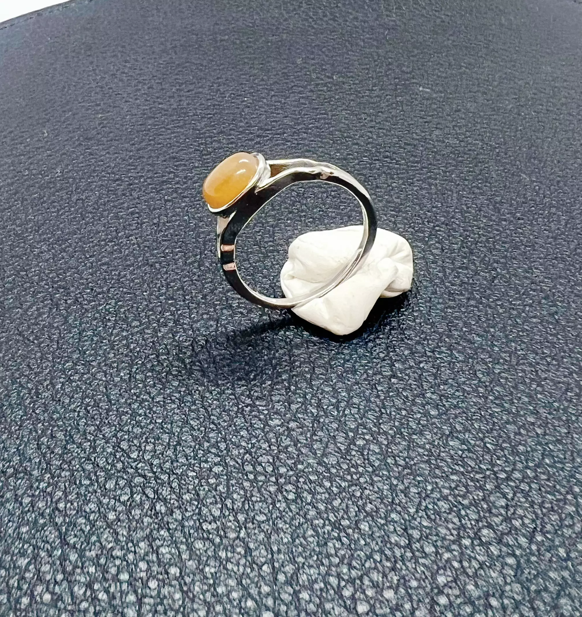 Bague ajustable en métal plaqué argent, ornée d’un cabochon ovale de quartz rutile de 9 × 7 mm , Un jaune doré traversé de fins filaments, idéale pour les doigts dès la taille 46.