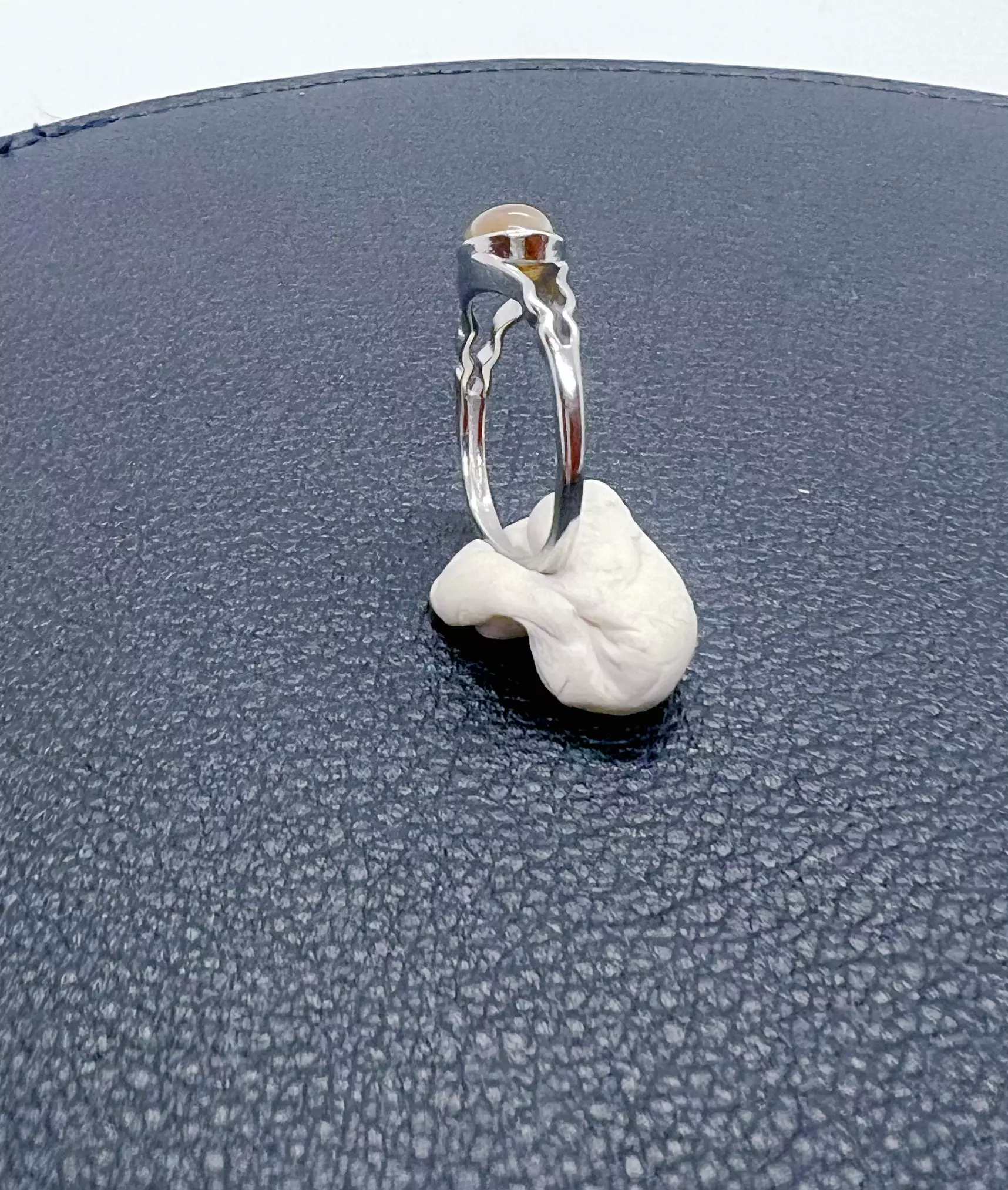 L’anneau présente une forme légèrement ondulée, qui accompagne la courbe du cabochon et apporte un côté organique, presque liquide. Grâce à son système ouvert, la bague se règle facilement et convient aux doigts à partir de la taille 46, pratique pour un cadeau ou pour s’adapter à une légère variation de tour de doigt.
