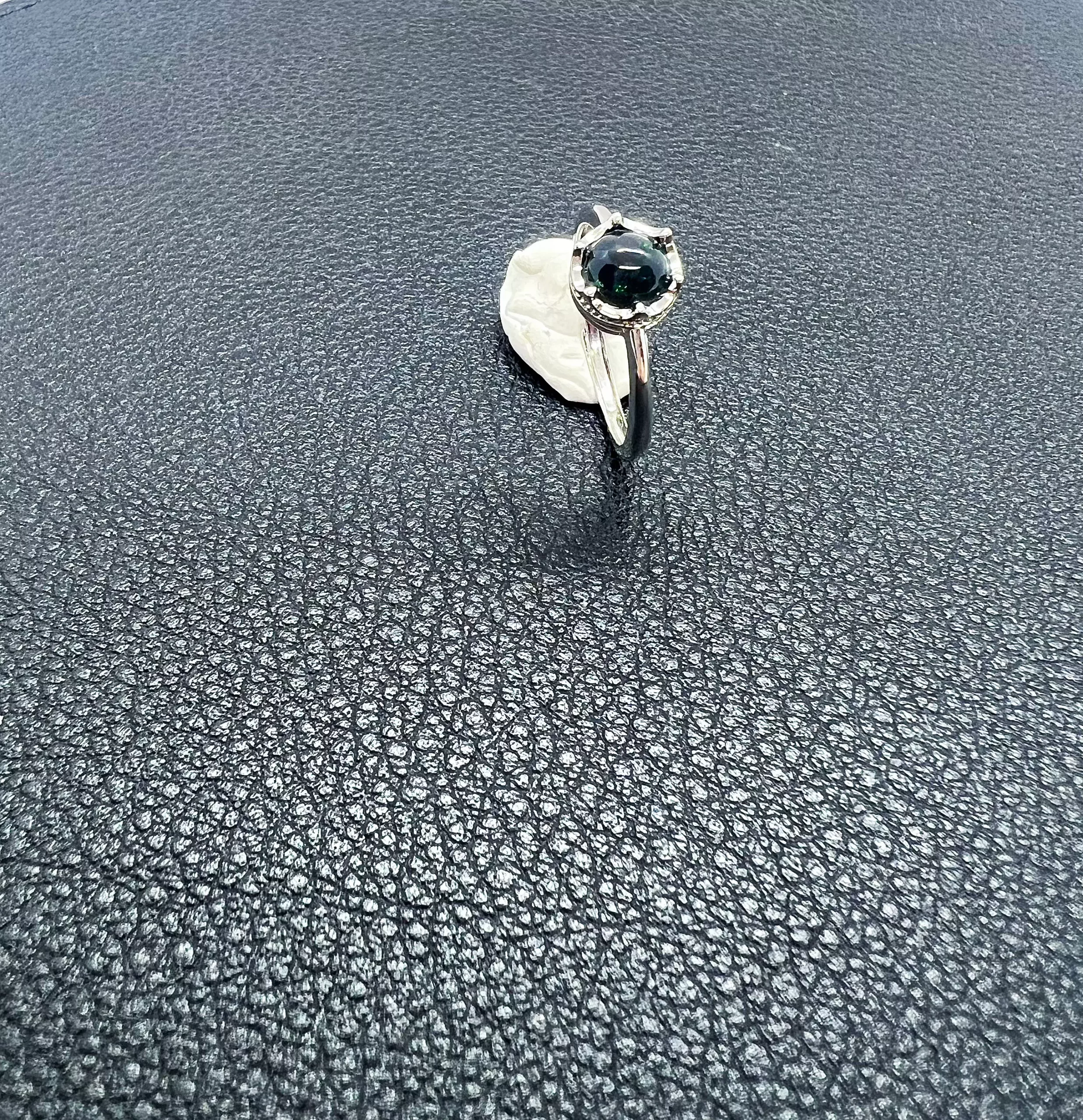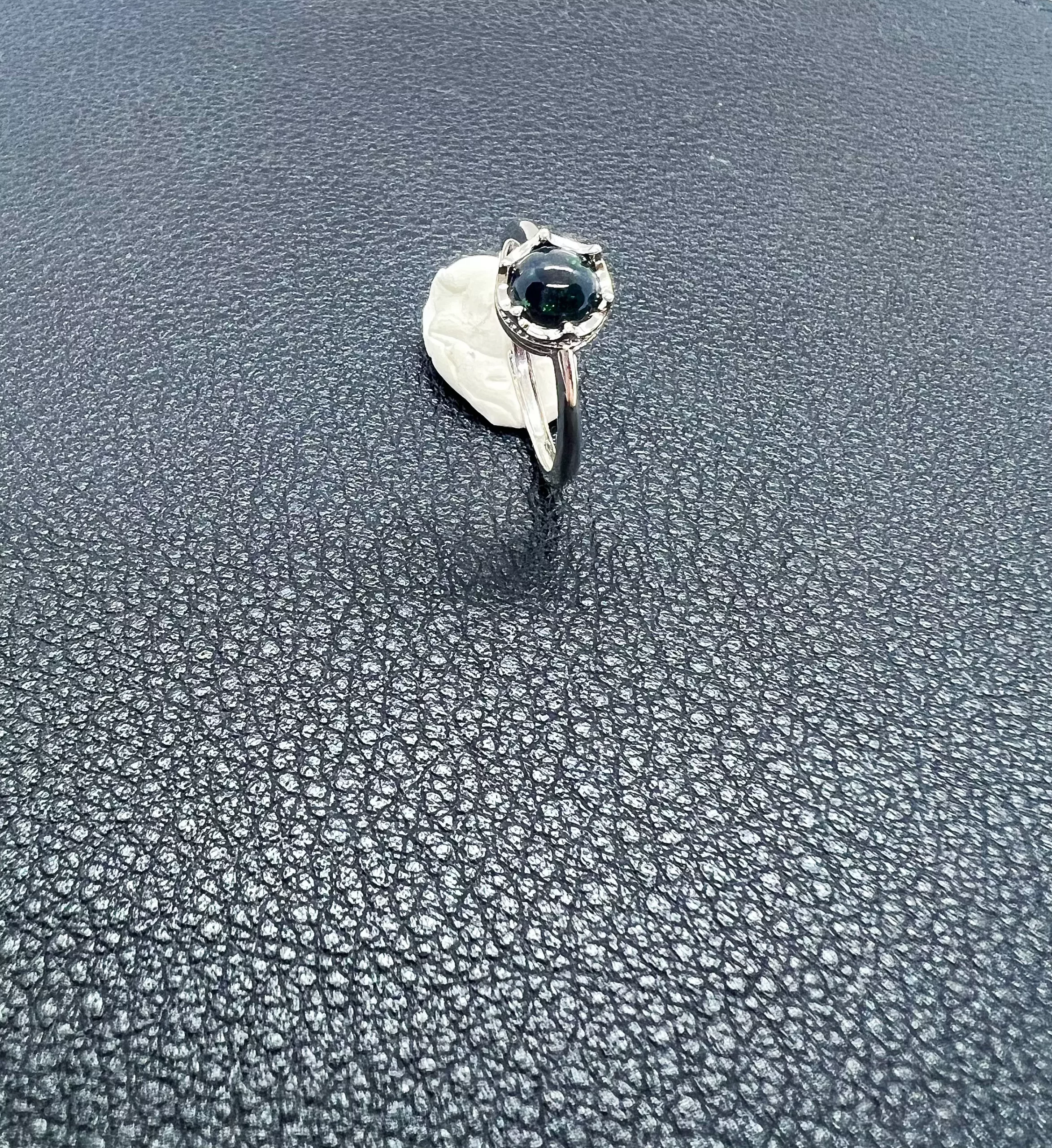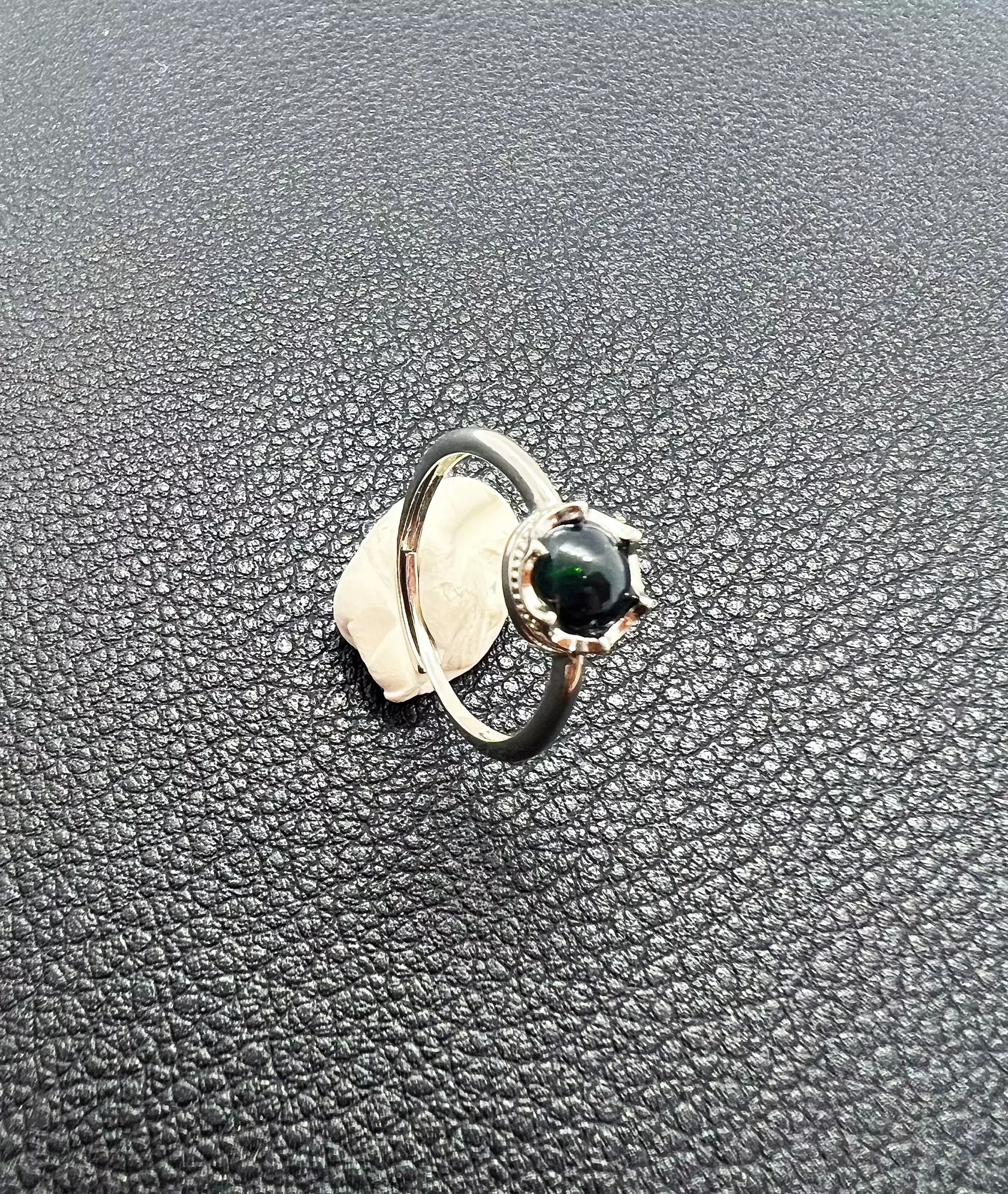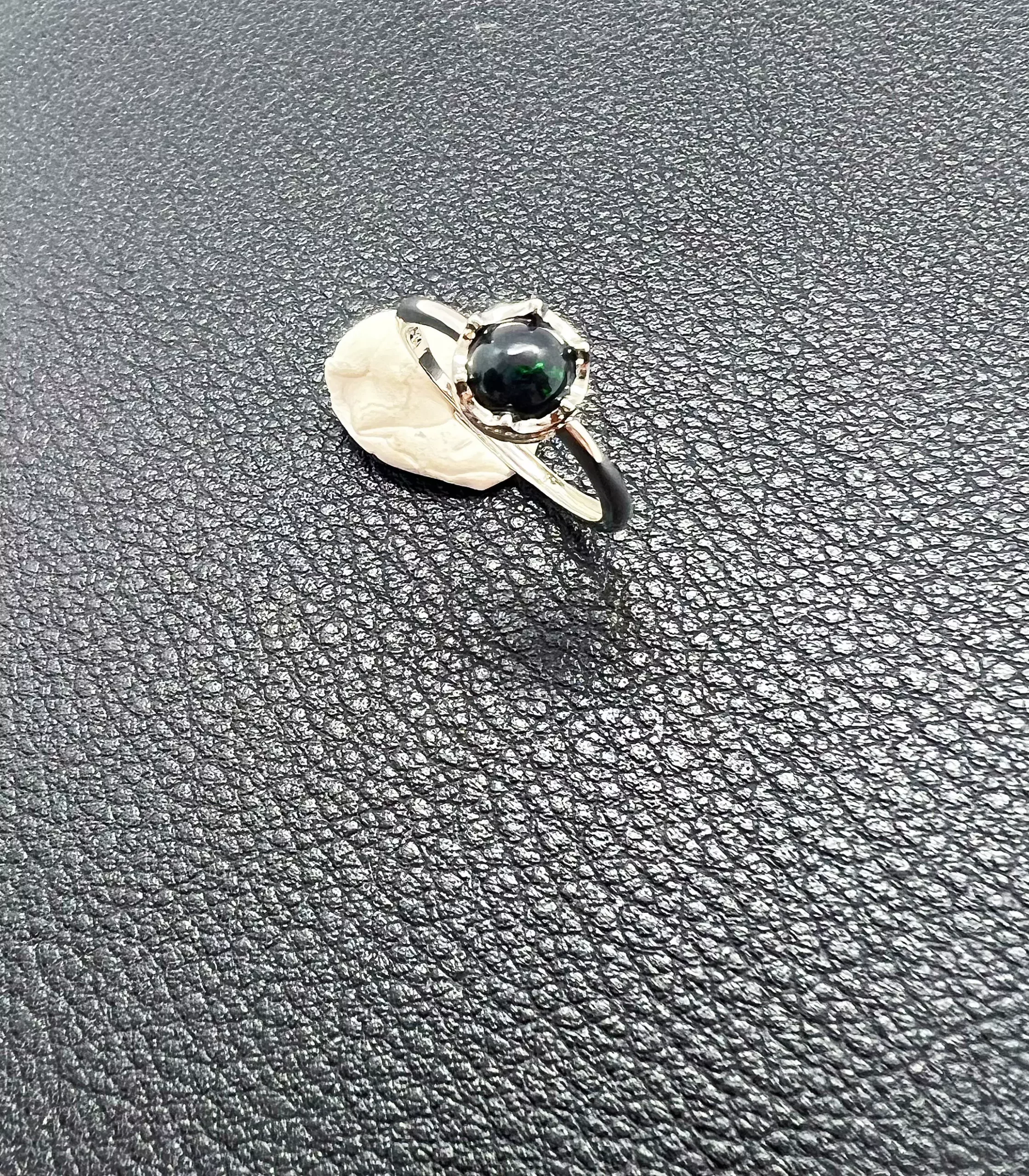 Sous son apparence noir intense, la pierre laisse surgir par instants une lueur verte — discrète, vive, presque vivante. Comme l’œil d’un hibou dans la nuit, elle accroche la lumière et la renvoie en un scintillement secret. Selon l’angle, l’opale semble s’éteindre… puis se rallumer, donnant à la bague un caractère profondément hypnotique.