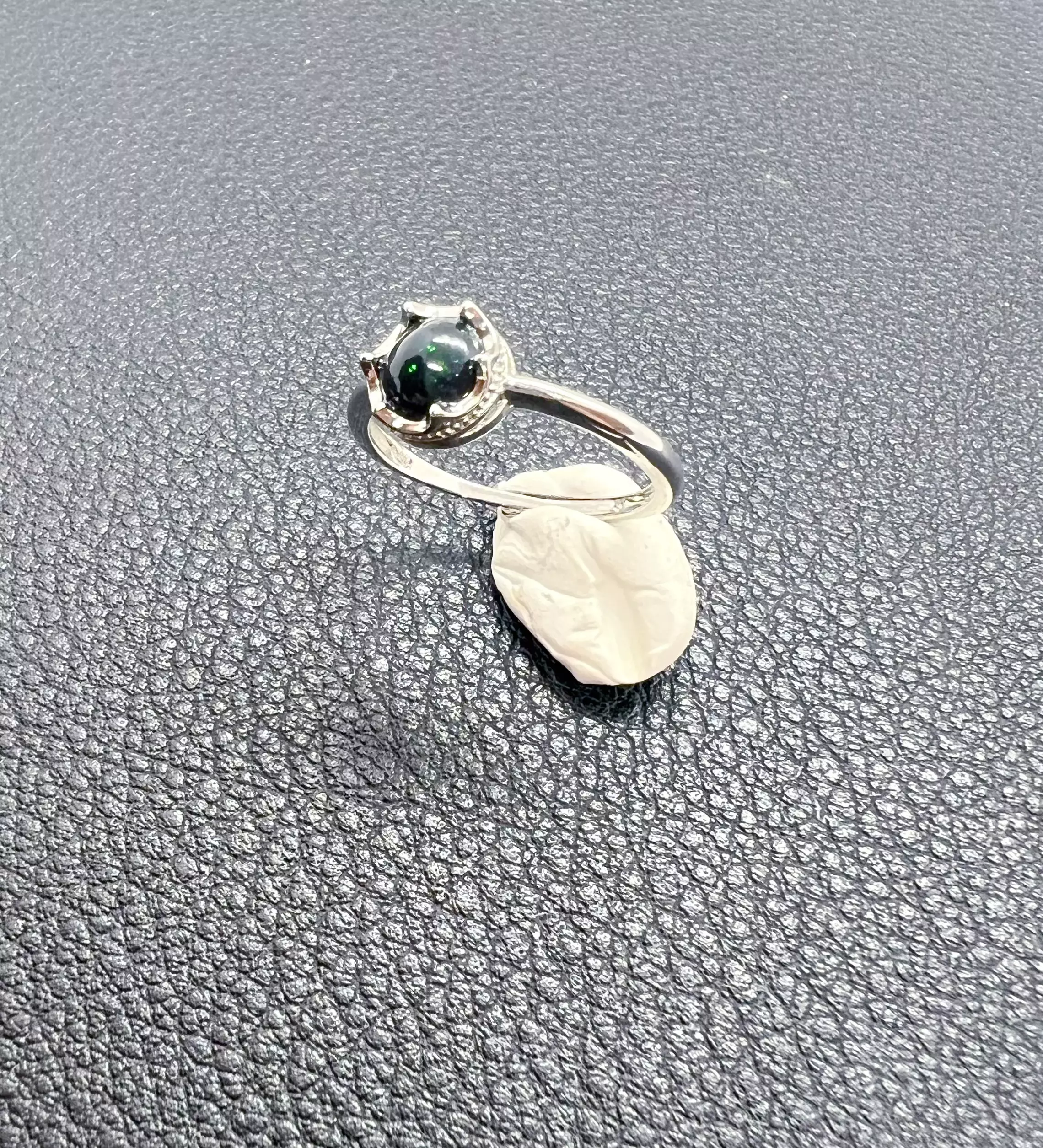 Bague réglable en plaqué argent, sertie d’une opale noire (cabochon 7 mm, épaisseur ≤ 4 mm) au noir profond, traversé de reflets verts lumineux. Un bijou mystérieux et élégant, adapté aux doigts jusqu’à la taille 49.