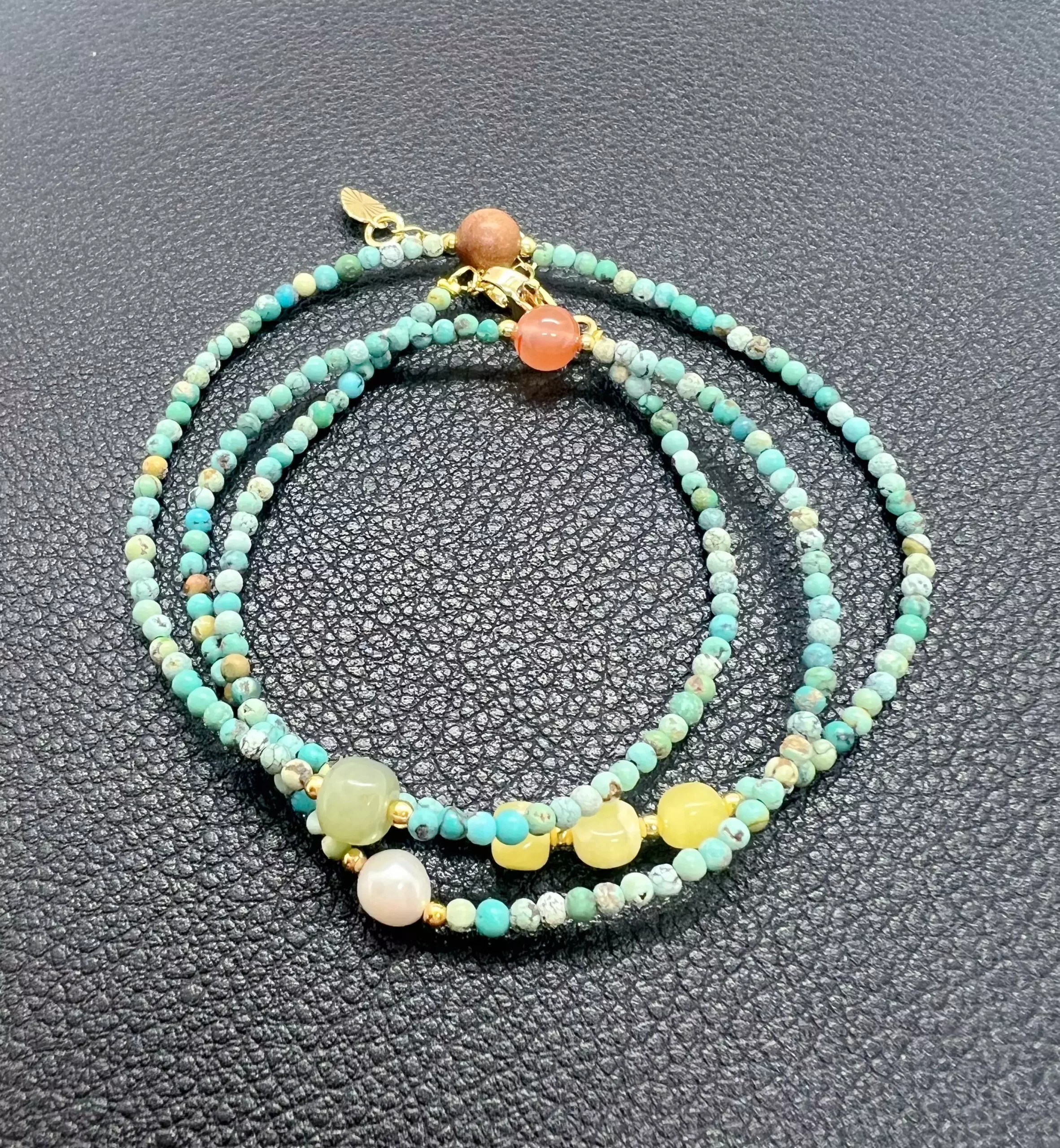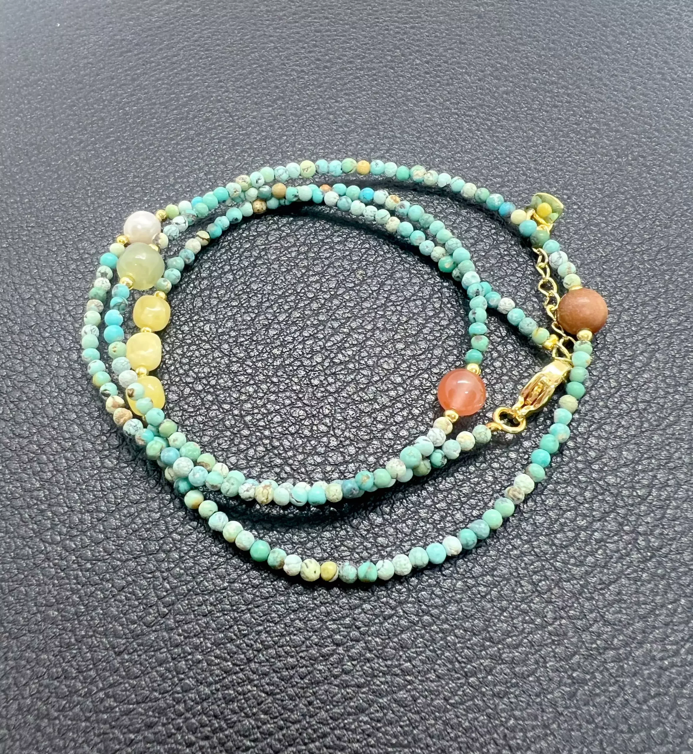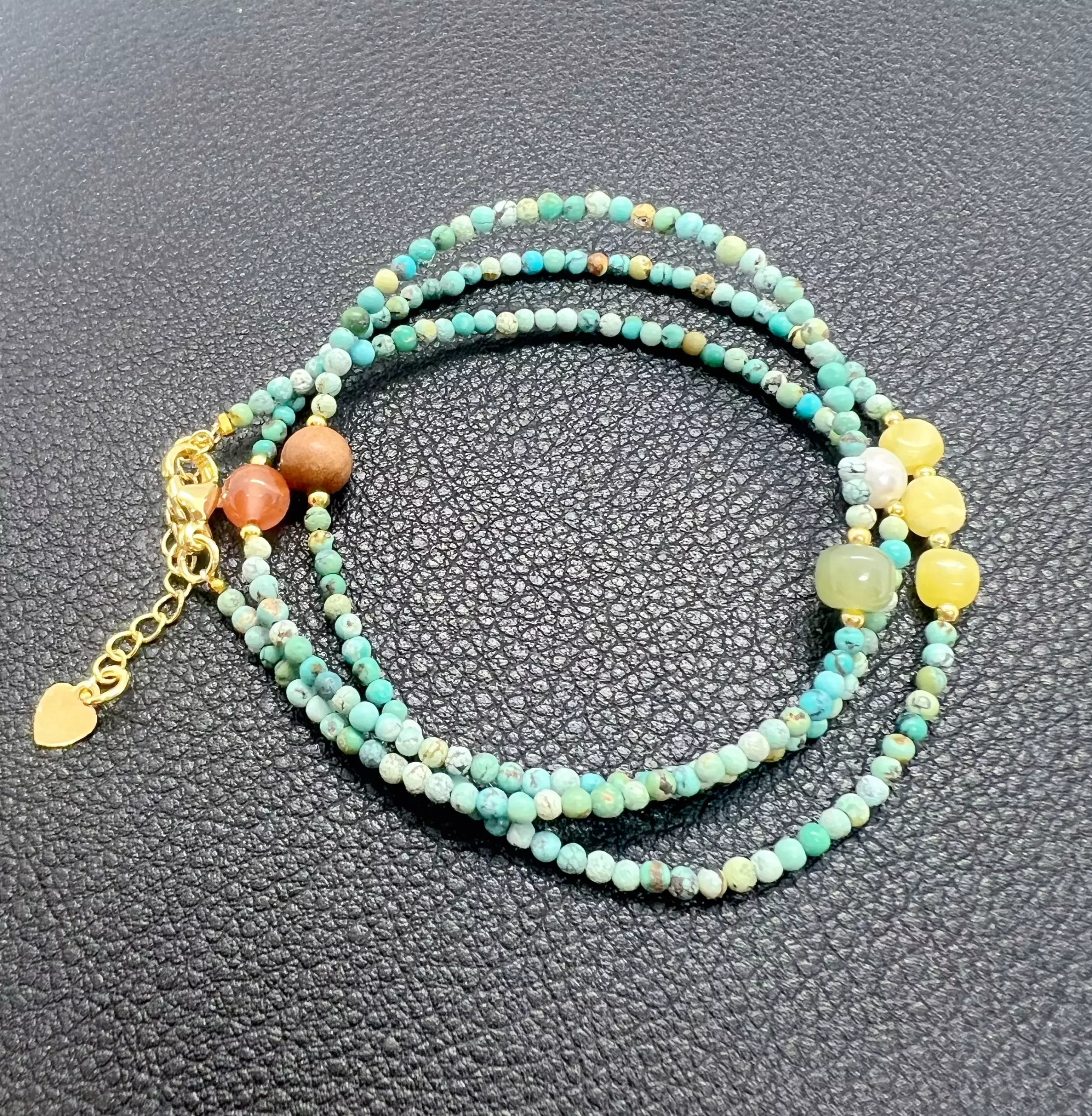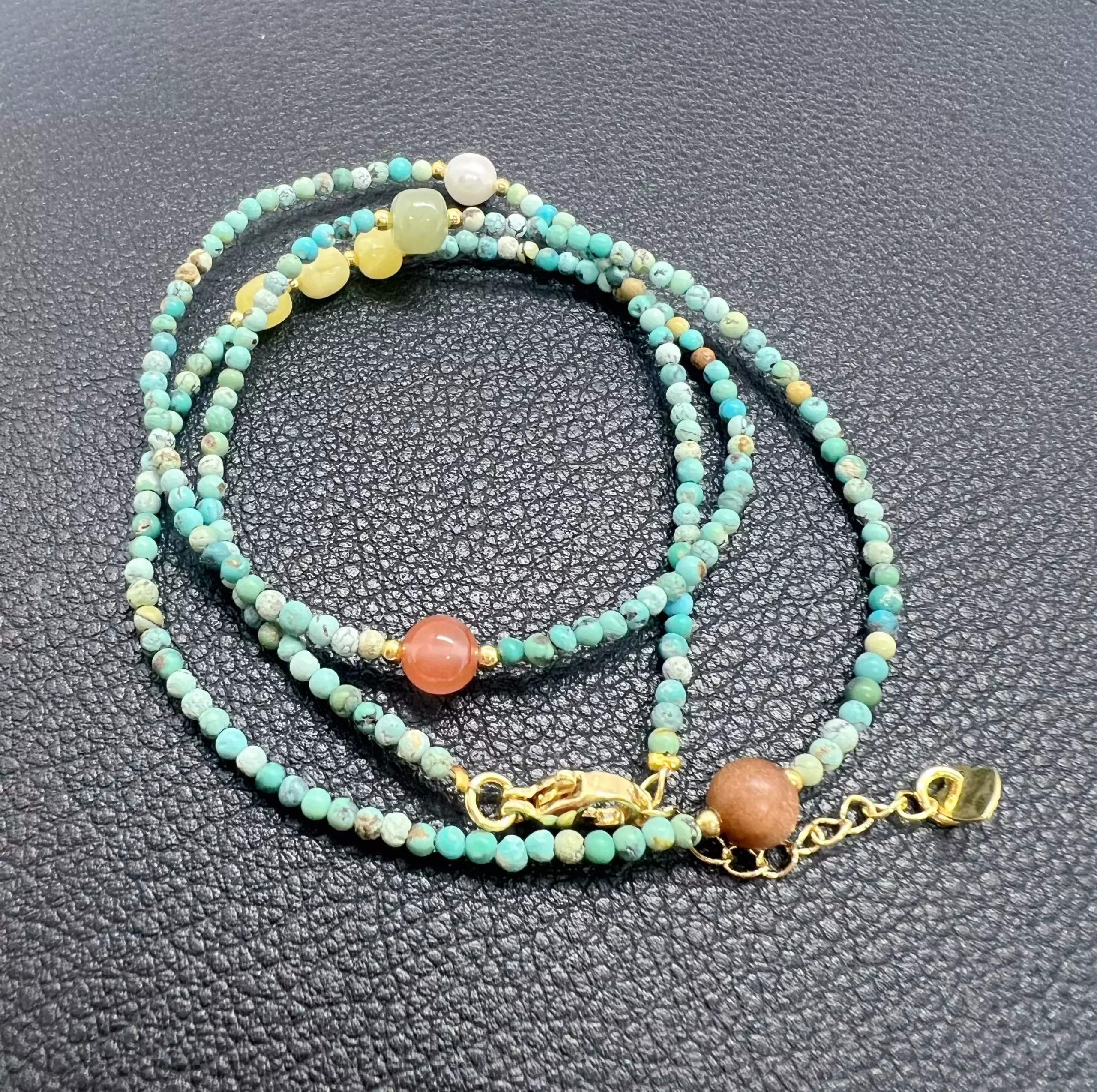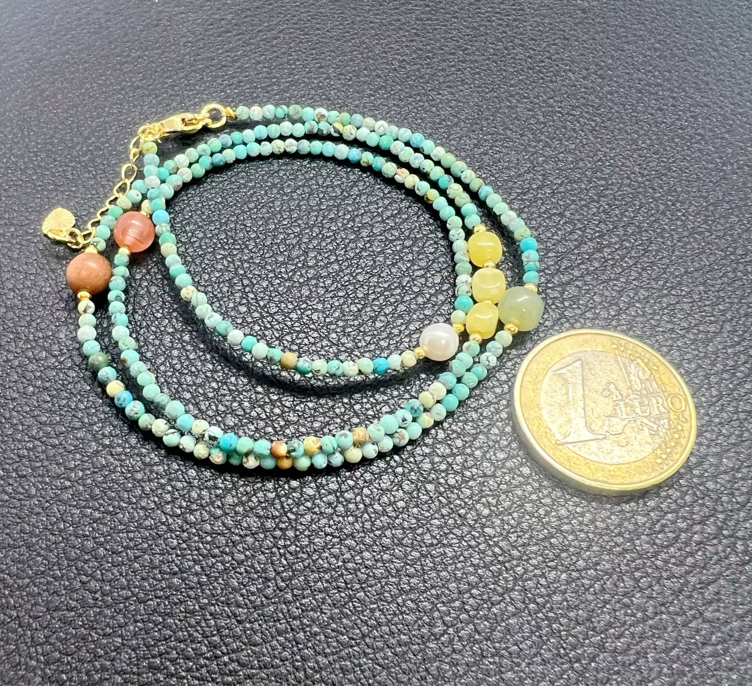 Les perles de turquoise facettée 2 mm dessinent la trame : un bleu minéral, presque ancien, vibrant comme une eau sacrée. Leur finesse capte la lumière sans jamais l’imposer — un éclat discret, intime.