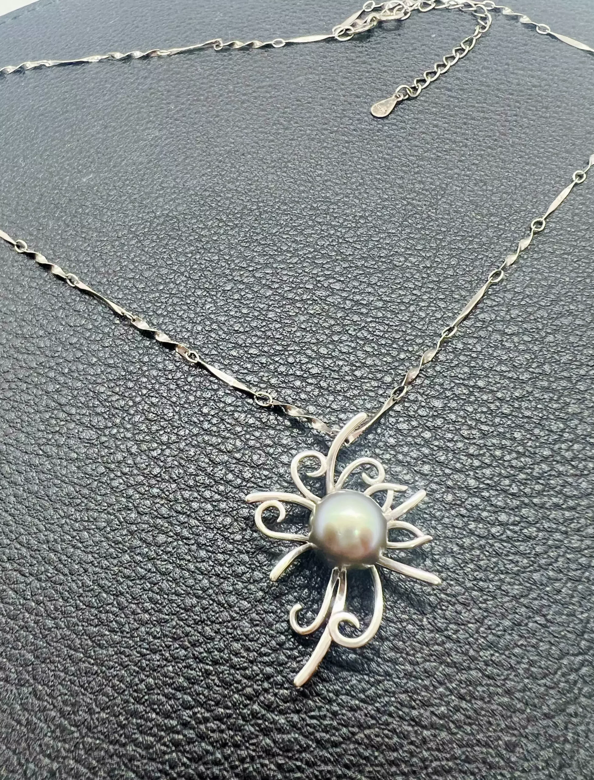 Perle de Tahiti d’environ 10 mm aux reflets argentés, violets et vert paon, sertie au cœur d’un pendentif fleur stylisé en argent 925 rhodié. Chaîne ruban torsadé de 40 cm, complétée d’une rallonge de 5 cm. Un collier aérien et élégant où la perle de Tahiti apporte une touche de mystère. Vidéo sur demande