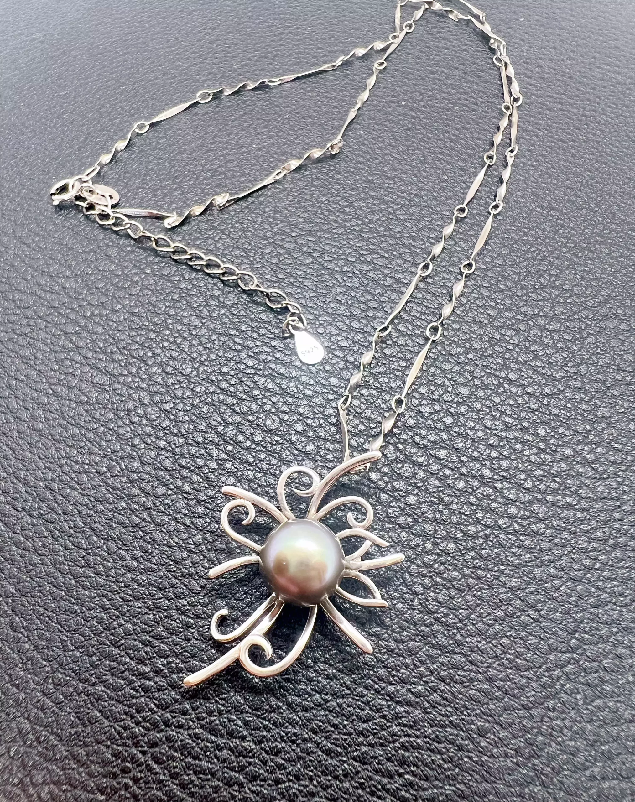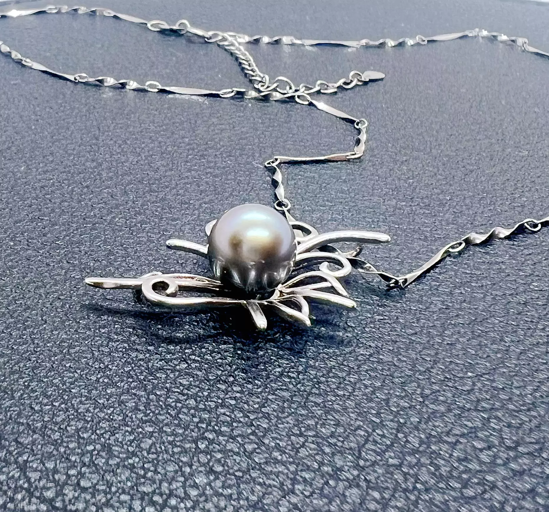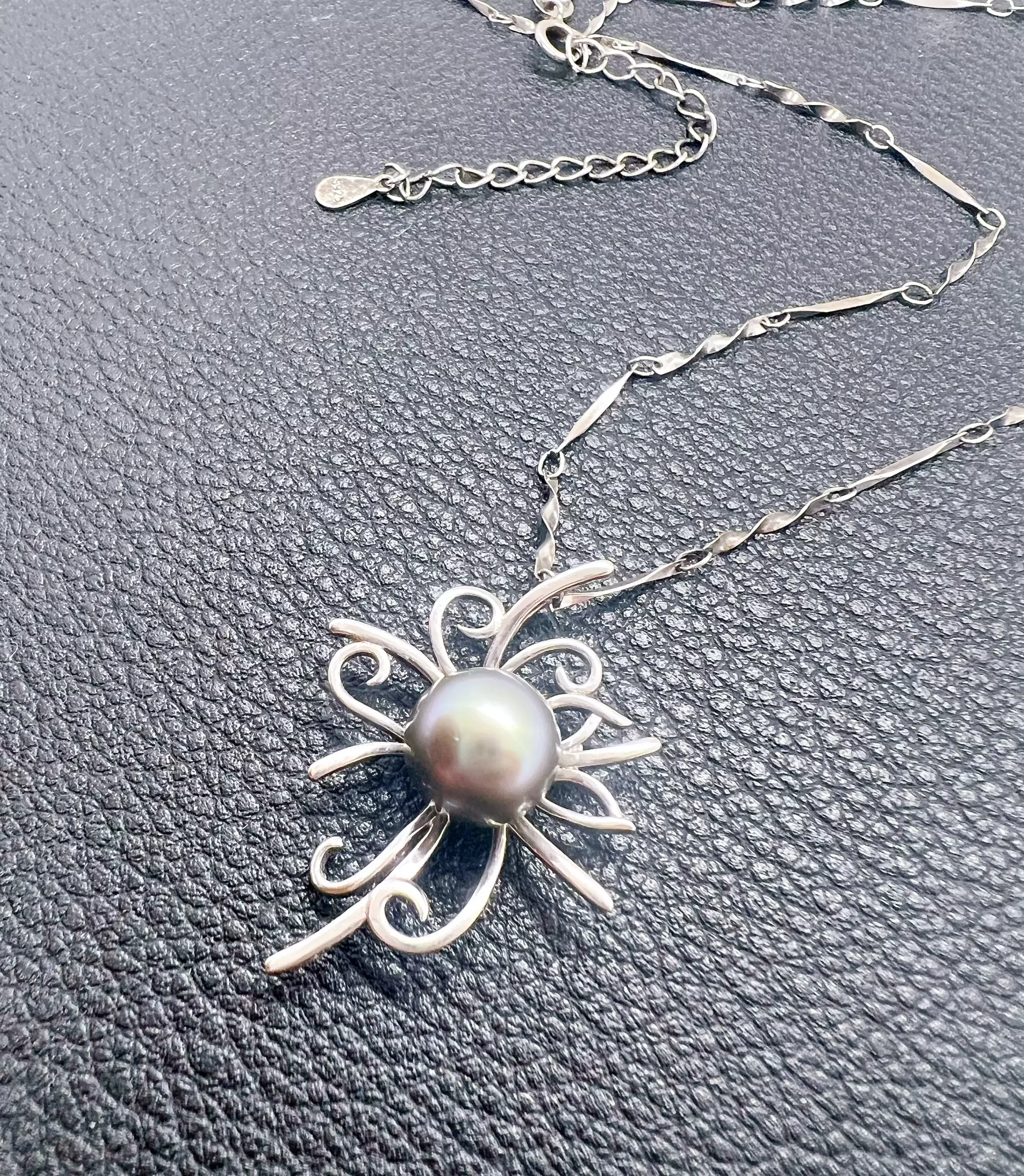 Au centre du pendentif, une perle d’environ 10 mm, aux reflets argentés mêlés de violet et de vert paon, capte la lumière avec une douceur mystérieuse. Ses nuances changeantes évoquent les lagons polynésiens à la tombée du jour, lorsque les couleurs deviennent plus profondes et plus secrètes.