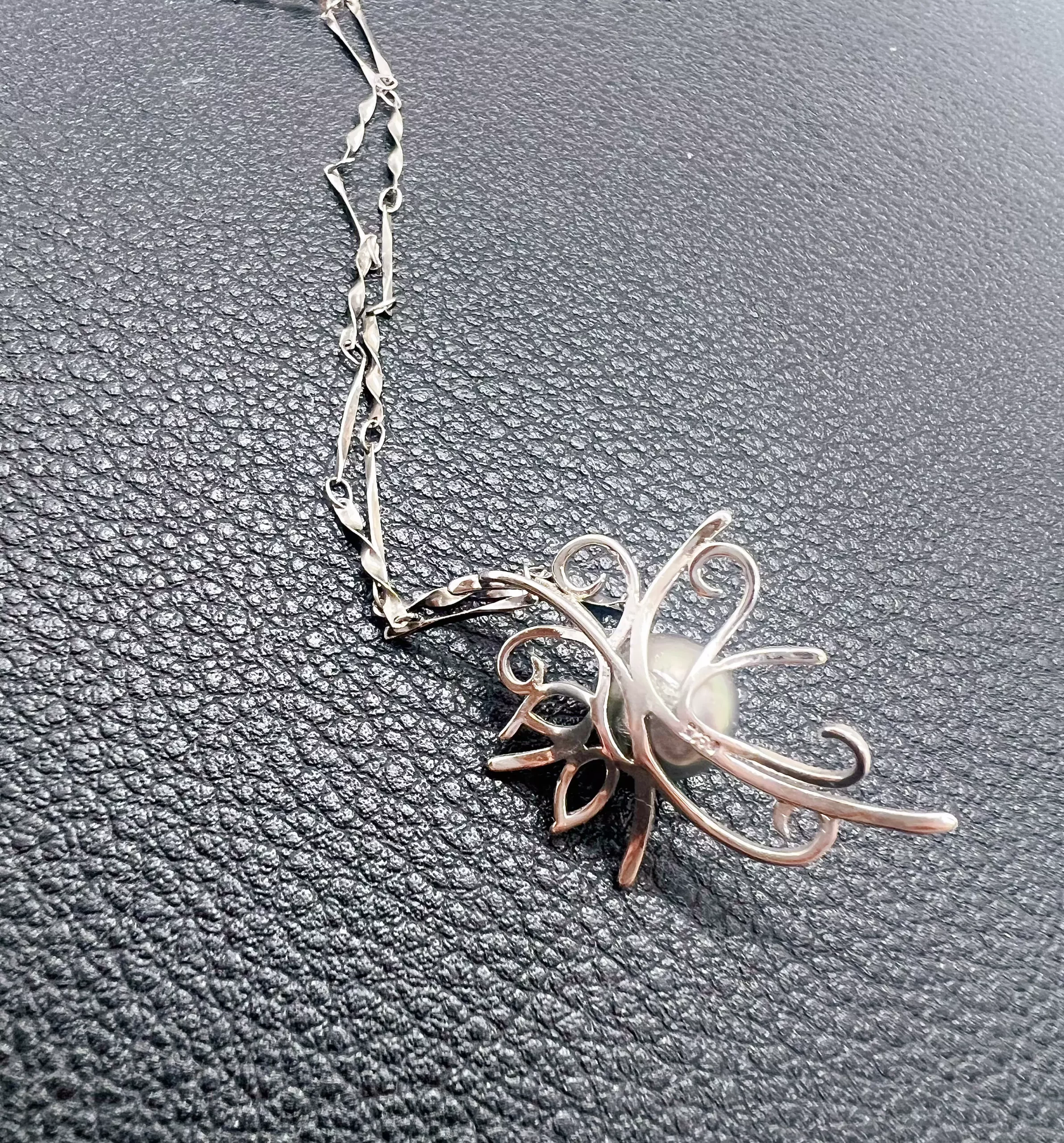 Le pendentif est façonné en arabesques légères qui dessinent une fleur moderne, ouverte et aérienne. Cette structure fine souligne la rondeur de la perle sans jamais la dominer.