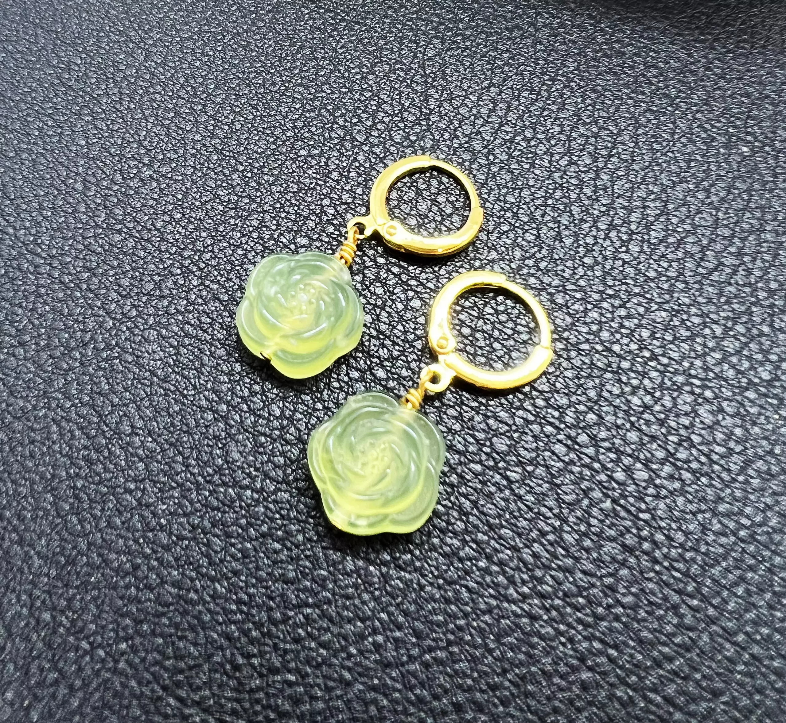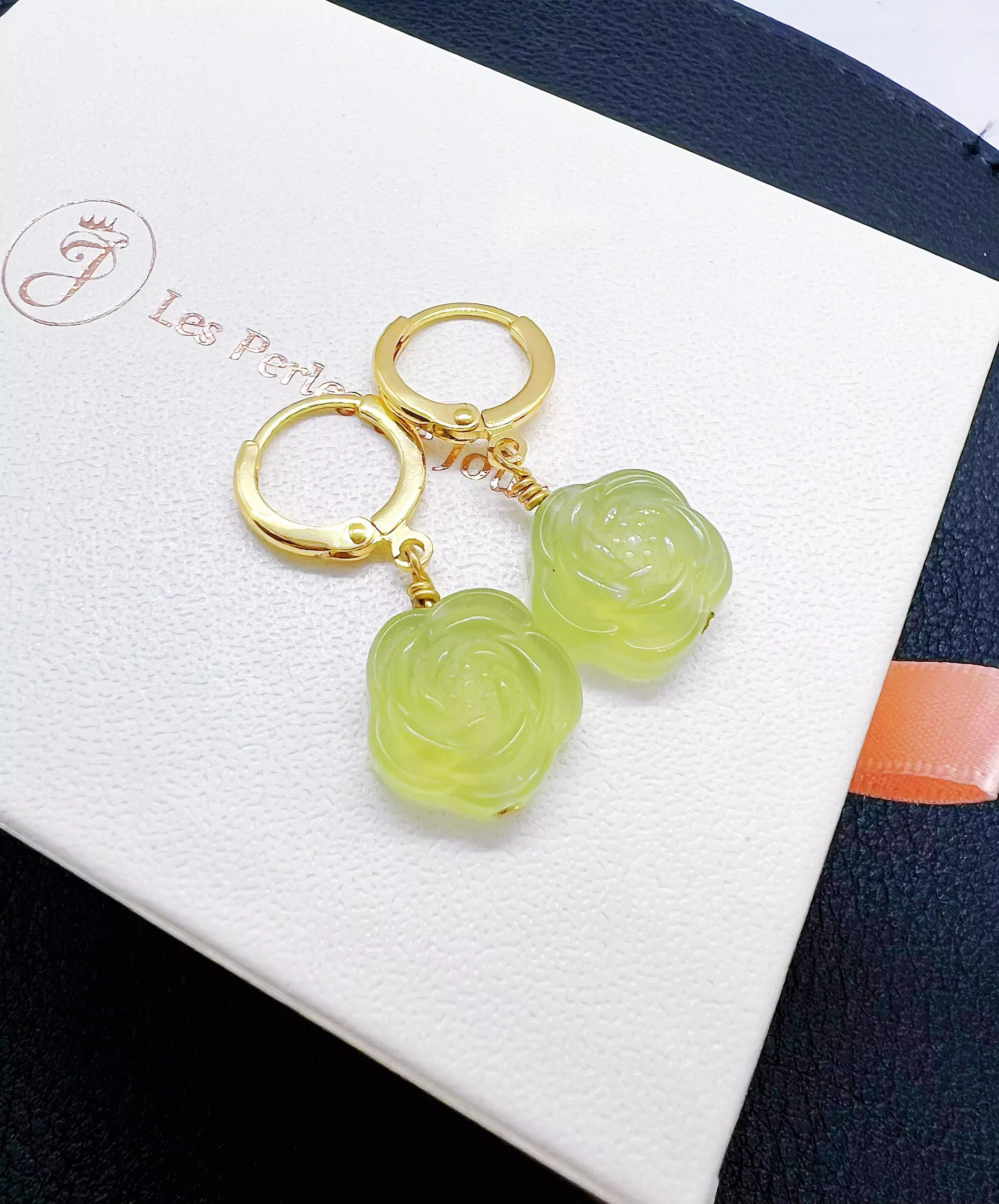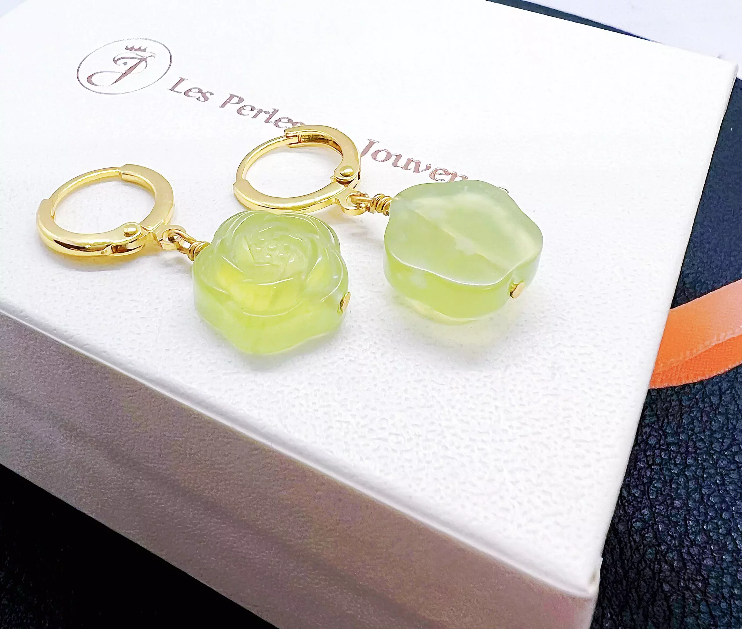 Créoles fines en argent 925 plaqué or ornées de préhnites naturelles sculptées en rose 14 mm. Teinte vert raisin, cristalline avec de légers voiles laiteux caractéristiques. Longueur totale 3 cm.