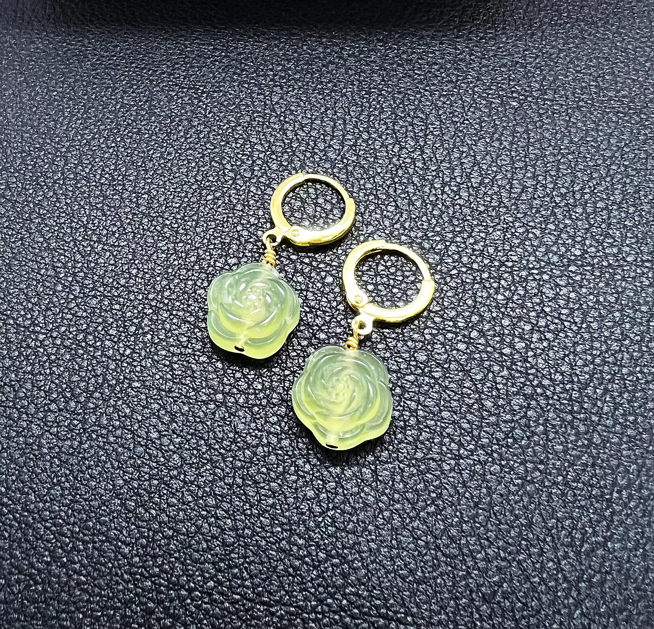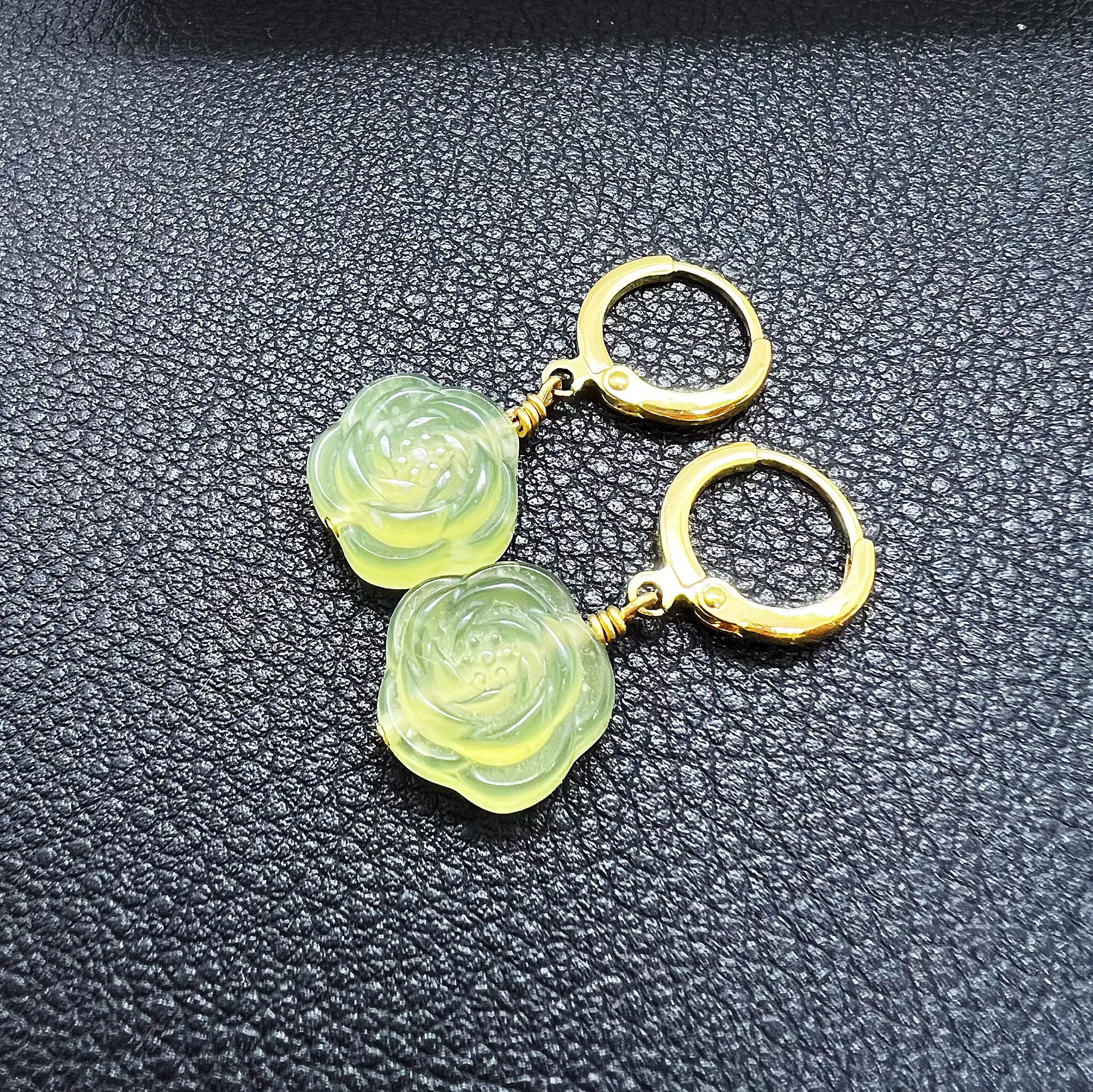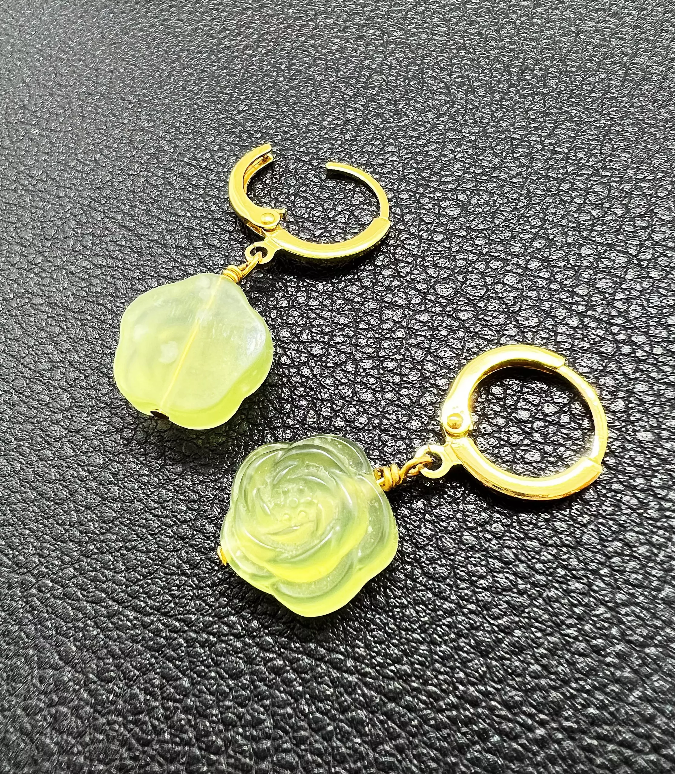 Créoles fines en argent 925 plaqué or ornées de préhnites naturelles sculptées en rose 14 mm. Teinte vert raisin, cristalline avec de légers voiles laiteux caractéristiques. Longueur totale 3 cm.