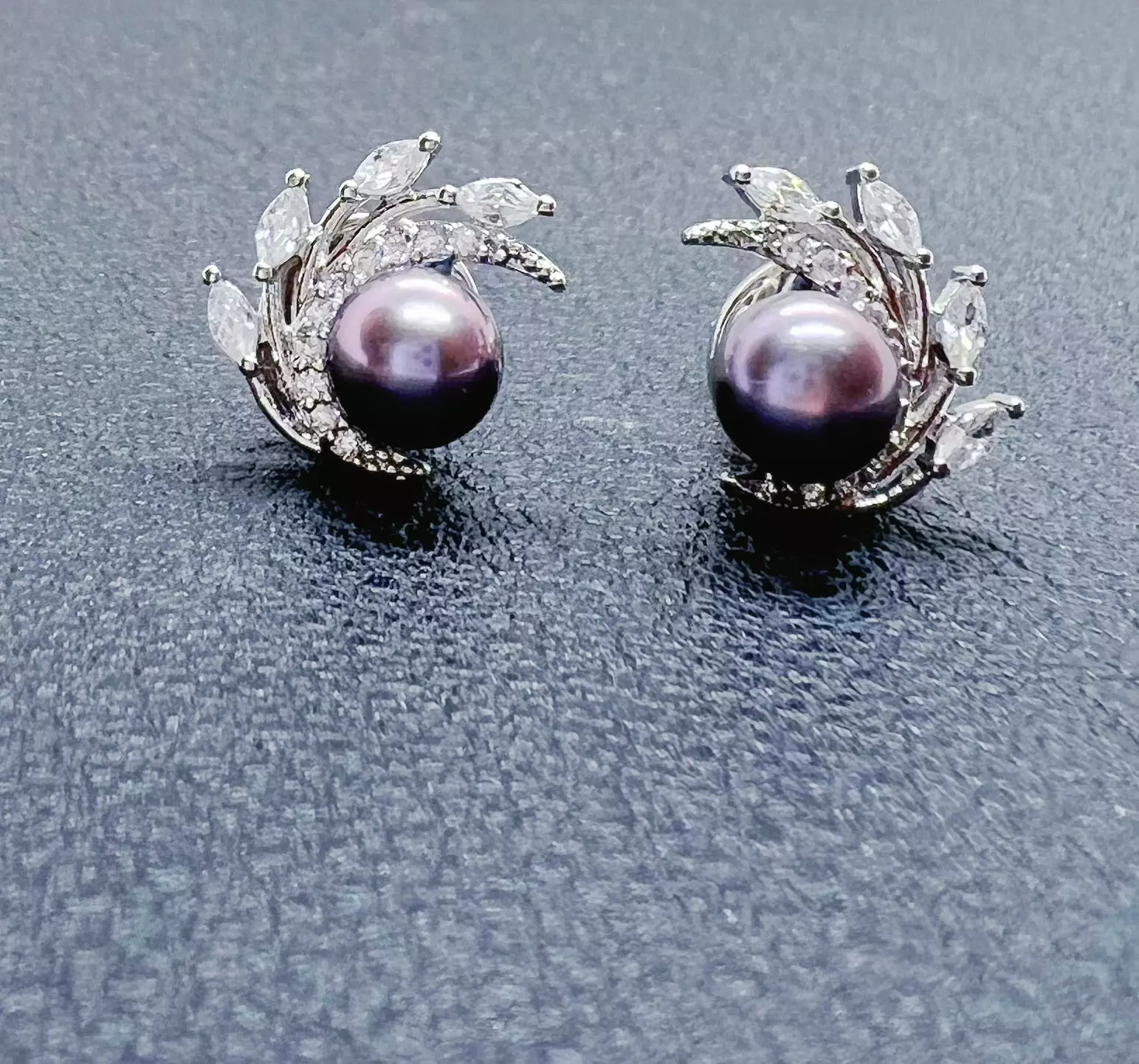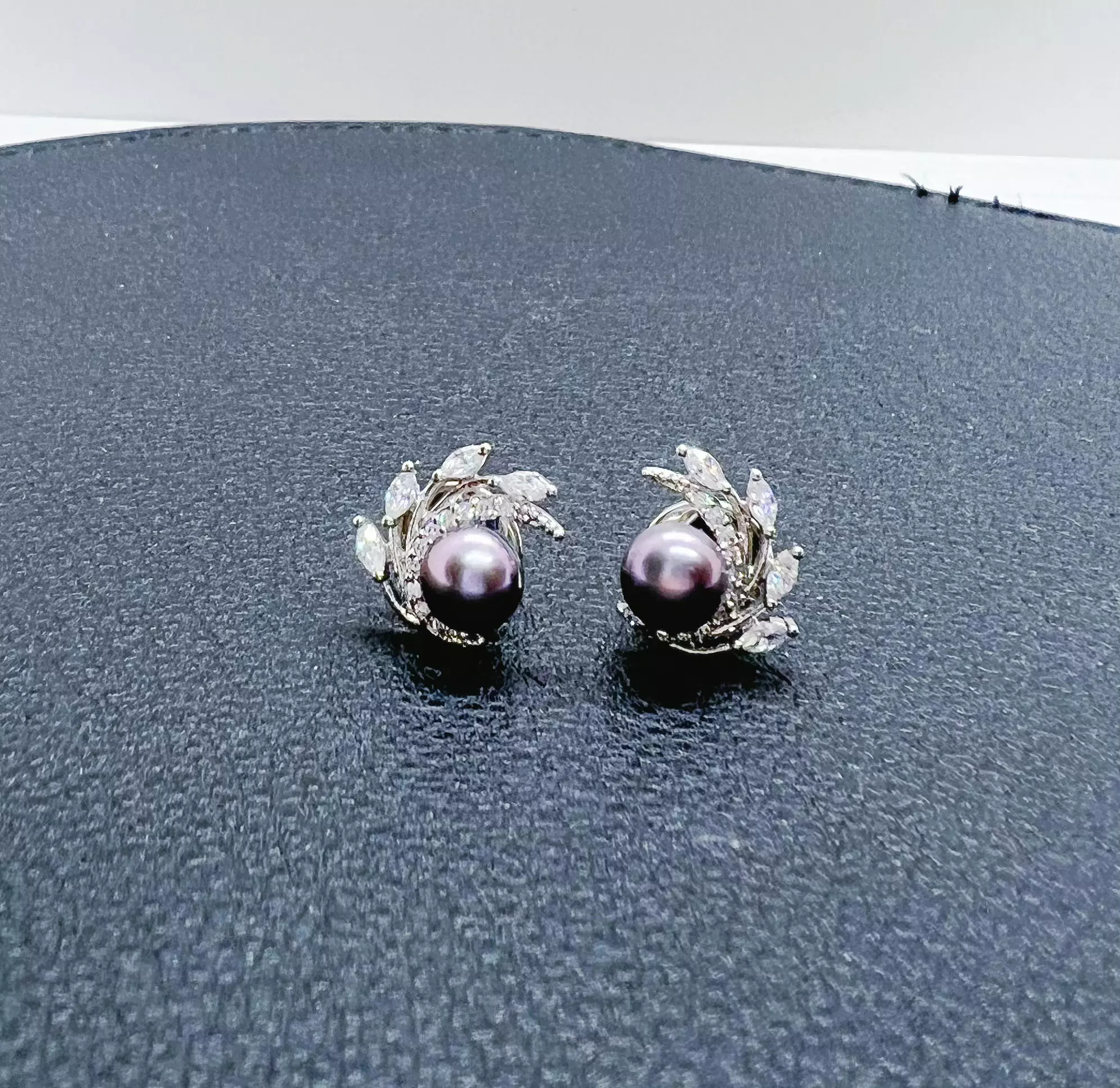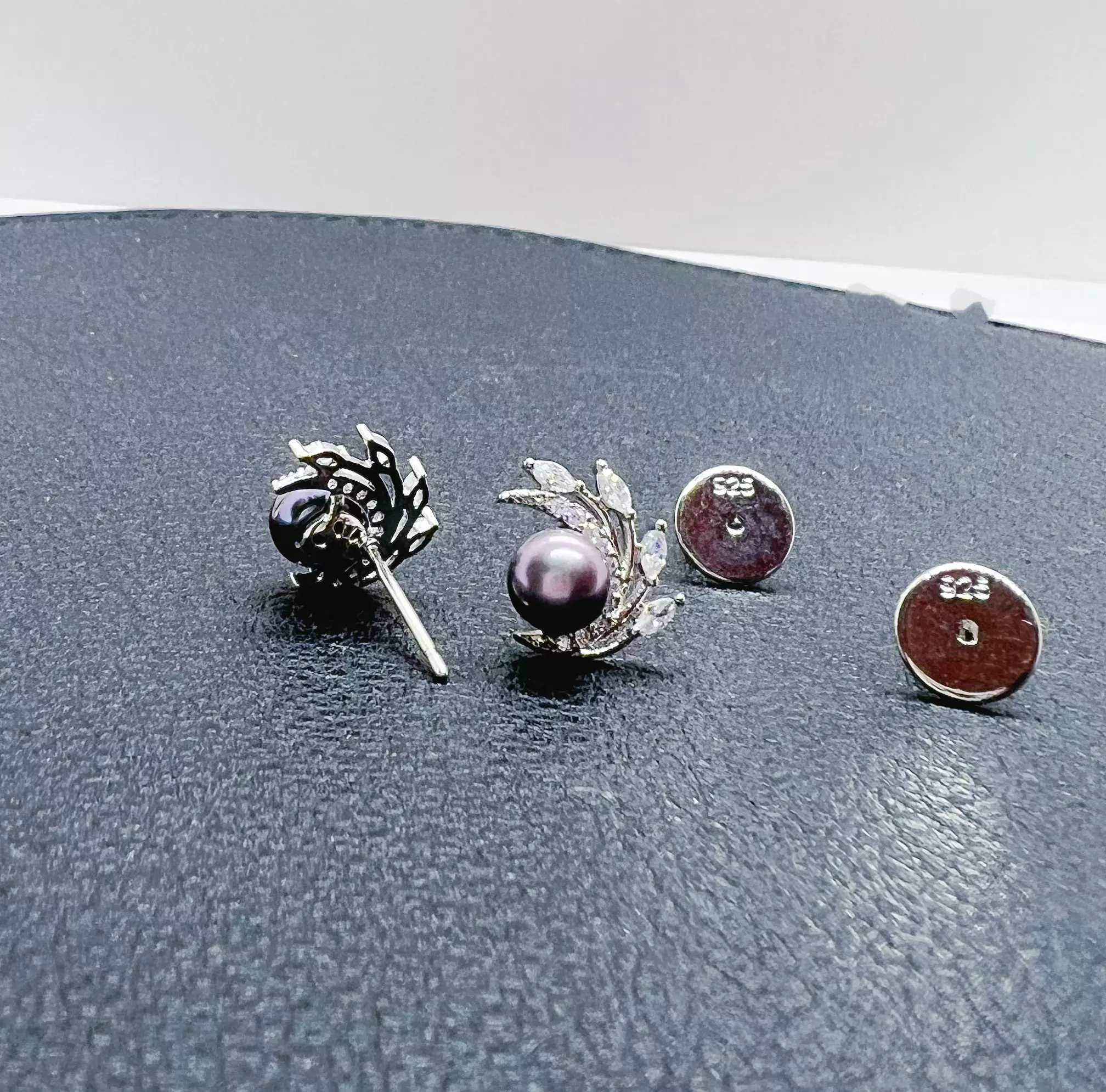 Puces d’oreilles en argent 925, perles d’eau douce prune de 4 mm entourées d’un éventail de plumes serties de zircons, diamètre 12 mm, avec fermoir rond large pour un maintien parfait sur le lobe.